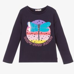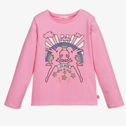 Ivory top for girls by Billieblush, made in soft cotton jersey. The front has a shiny and iridescent dragonfly illustration, with a neon pink slogan print below.