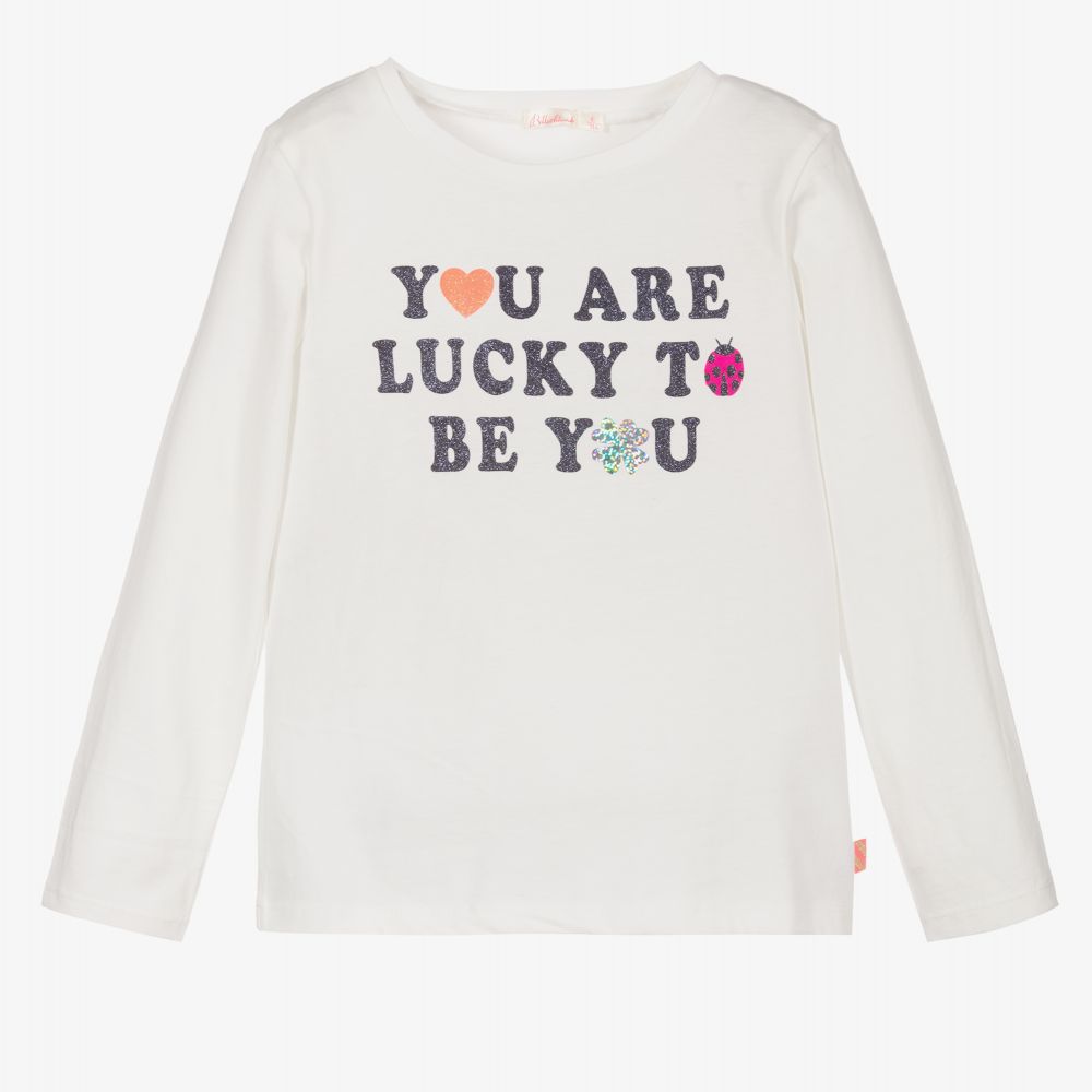 Girls ivory top by Billieblush, made in soft cotton jersey. It is printed with the words 'You are lucky to be you' in sparkly black with a neon orange heart and pink ladybird.