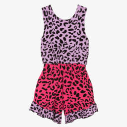 Neon pink playsuit for girls, by Billieblush. Made from soft cotton jersey, it has neon orange ruffle-trimmed sleeves, an elasticated waist for a casual fit, and a relaxing flamingo print with pink glitter trims on the front. There are shoulder poppers for ease when dressing.