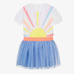 Summery pink dress for girls by Billieblush, with a glitter and sequin 'Sunshine Girl' print on the front. The comfortable, cotton-blend, jersey bodice has puffed sleeves and the brand's signature logo tab on one side. The pink skirt is made in layers of soft, glittery tulle, with a sparkly pink elasticated waistband. The skirt is lined in pink voile for comfort.