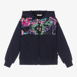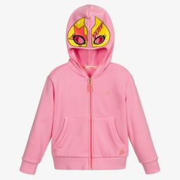 Fun pink zip-up hoodie for girls by Billieblush, made in soft cotton sweatshirt jersey. Patterned with a black leopard print, with navy blue and neon yellow paint effect splashes, it has sporty striped ribbed cuffs, and front pockets.