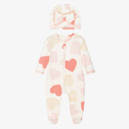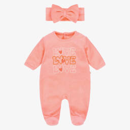 The pale pink graphic babygrow with feet and bow hat set for girls by Billieblush is crafted from soft organic cotton jersey, offering comfort and style. Featuring tulle trims and glittery 'Love Love' lettering on the front, it adds a touch of playful charm. The practical popper fastenings on the back ensure easy dressing, while the adorable hat is adorned with a large bow. Limited quantities are available, making it a must-have addition to any little one's wardrobe.