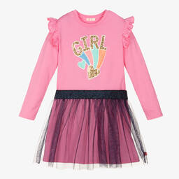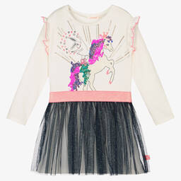 Ivory dress for girls by Billieblush, made in soft jersey with a sparkly mint green tulle skirt overlay. It has ruffle shoulder trims and a glittery 'BFF' print on the front in pale yellow, pink and blue.
