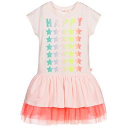 Girls white jersey dress from Billieblush, made in soft and comfortable cotton jersey. It has a lovely bird design in neon pink, pale pink, green and blue, with shiny sequins. The dropped waist, gathered skirt has layers of neon pink tulle and is lined in lightweight cotton voile.