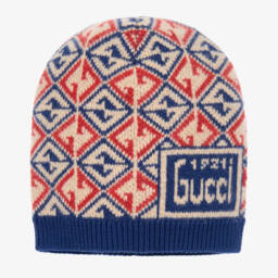 Blue Tennis 1977 high-top trainers for boys and girls by luxury Italian brand, Gucci. They are woven with a geometric GG logo in shades of blue and white. The Gucci Tennis 1977 label can be found on the tongue and they have signature green and red Web trim on the side. They fasten with laces and have a side zip with a branded velcro tab for ease. The ivory non-slip sole is embossed with logos for the ultimate designer finish.
