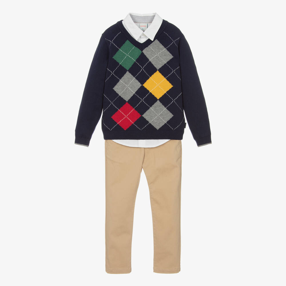 Smart-casual navy blue and beige trouser set for boys by Boboli. Woven in soft cotton, the white shirt has a pointed collar and fastens with buttons. The beige twill trousers have pockets on both the front and back, an adjustable waistband and a button and zip fastening. A lovely argyle patterned V-neck knitted sweater completes the set, it has stretchy ribbed trims and coordinating grey elbow patches.