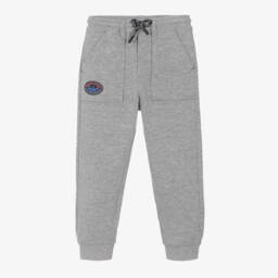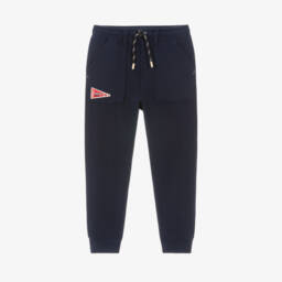 Boys blue cotton jogging trousers by Boboli offer a great combination of comfort and style for younger boys. Crafted from soft, mid-weight cotton jersey with a fleecy interior, these joggers feature ribbed cuffs and a functional drawstring waist for easy wear. The sporty design is enhanced by two front pockets, one with a red varsity flag. Ideal for casual days, these joggers are in limited quantities, making it a last chance to buy.