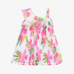 Multicoloured dress for girls by Boboli, made in soft cotton jersey. Relaxed and easy wearing, the stretchy fabric has a colourful tropical palm tree print with white trims. It has an adjustable drawstring waistband and a logo patch on the hem.
