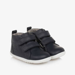 These blue hi-top trainers by Bobux offer a blend of style and comfort for little boys. Designed with a sleek navy leather exterior, they feature adjustable velcro straps for easy wear. The soft fabric lining and supportive sole ensure comfort during play.