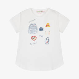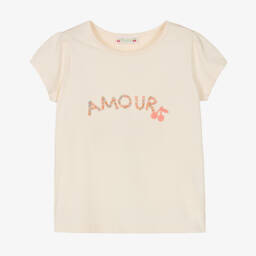 The ivory cotton cherry graphic T-shirt for girls by Bonpoint offers a touch of French elegance. Crafted from soft cotton jersey, it features a charming red cherry design on the front, adding a playful yet sophisticated element. Button fastenings on the shoulder ensure easy dressing, making it perfect for everyday wear. Limited quantities available, don't miss the chance to add this delightful piece to a child's wardrobe.