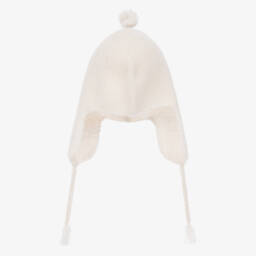 Green hat for boys and girls by French brand Bonpoint, knitted in soft and comfortable Merino wool. It has an ivory and red Fair Isle pattern, with cosy ear flaps to keep ears warm. There are plaited strings on the ear flaps, with tassels on the ends and there is a matching tassel on the top of the hat.