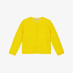 Bright yellow cardigan for teen girls by luxury French brand Bonpoint, knitted in beautifully soft cashmere. Patterned with the brand's signature cherry motif in a soft pointelle knit, it has front button fastenings and ribbed trims for a seamless classic look.
