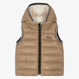 Boys beige convertible vest by BOSS offers a stylish dual-look option perfect for the autumn and winter seasons. This versatile gilet features a sleek, reversible design with a beige exterior and a contrasting light interior, ideal for any occasion. Crafted with attention to detail, it includes a cosy hood and secure zip fastening, ensuring warmth and comfort. Ideal for layering over jumpers or shirts, this piece is available in limited quantities—last chance to buy this season's must-have.