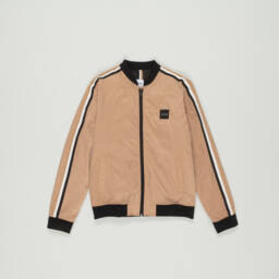 The boys black and beige hooded jacket by BOSS features a stylish colourblock design with a silky sheen. The jacket includes a distinctive tonal logo on the front and a monogram badge on the sleeve, complete with signature striped cuffs. Crafted from lightweight polyester, it offers taped zip fastenings and a breathable mesh lining, ideal for layering during spring and summer. With limited quantities available, it's a last chance to buy this chic and practical piece.