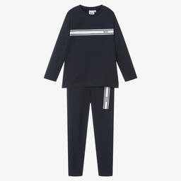 Grey marl and black pyjamas for boys by BOSS, made in soft cotton jersey for a comfortable night's sleep. Each piece is printed with a striped logo motif in black or white, with branded tabs on the side seams for a signature designer look. The trousers have a gently elasticated waistband and the set comes in a branded storage pouch, ideal for travelling.