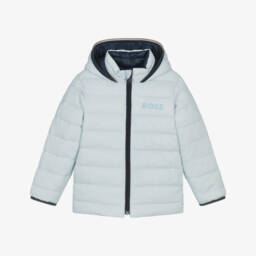 Cosy hooded jacket by BOSS for little boys in a stylish shade of ivory. This padded jacket combines smooth and ribbed corduroy-style panels for a textured look. It has two useful pockets and elasticated trims to keep the warmth in. The front zip fastens neatly up to the chin and there is a tonal embroidered logo on the chest for a signature finish.