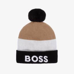This charming striped knitted hat for boys by BOSS is lovely for chilly days. Crafted from soft cotton, it features a cosy fleece lining for added warmth, complete with a playful pom-pom on top. The turn-up brim displays a bold logo, adding a touch of designer flair. Ideal for keeping warm during outdoor adventures, this hat is available in limited quantities, so don't miss the chance to secure this stylish accessory.