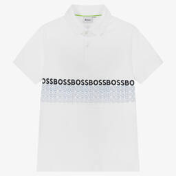 Navy blue Mini-me polo shirt for teen boys by BOSS, characterised with a blue and white stacked logo print across the front. Made in comfortable cotton piqué, this casual staple has a ribbed collar and cuffs, with vented sides for a sporty appeal. In classic polo style, there are branded fastenings on the white button placket.