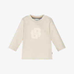 The white long sleeve shirt for teen boys by BOSS features a striking navy blue logo on the front, offering a touch of sophistication. Crafted from soft, stretchy cotton jersey, this top is suitable for everyday comfort and great for layering. With a classic ribbed crew neck, it's designed for both style and functionality. Limited quantities available, so don't miss out on this must-have piece for the season.