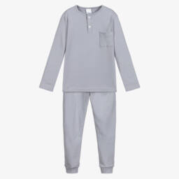 Grey and black BOSS pyjamas for teen boys, with black and white striped logo motifs and embroidered tabs for a distinctive branded look. Great for a comfortable night's sleep, they are made in soft cotton jersey. The trousers have an elasticated waistband and the set comes in a useful, branded storage pouch, ideal for travelling;