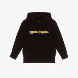 Black hoodie for boys by Palm Angels, made in soft cotton jersey with a warm, fleecy inside. This casual, cosy top has a yellow spray paint graphic on the front with the brand's Gothic style logo and a useful pouch pocket.