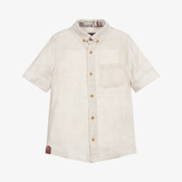 This blue and white check shirt for boys by Lapin House, features a charming polo theme print. Made in soft, lightweight cotton, it has contrasting beige, corduroy trims on the inside of the collar and cuffs and button tabs to secure rolled-up sleeves.