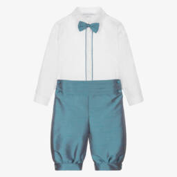 Traditional knickerbocker shorts set for boys by British brand Beatrice & George, exclusive to Childrensalon. Ideal for a special occasion, the white cotton shirt has a detachable, silky blue slub dupion bow tie, with matching piping on the placket and fastens and logo button fastenings. The coordinating blue knickerbockers have a lustrous pink sheen when they catch the light, smart pleats on the front and button-fastening cuffs. They are fully lined for comfort and have a useful adjustable waistband that fastens with buttons on the sides.