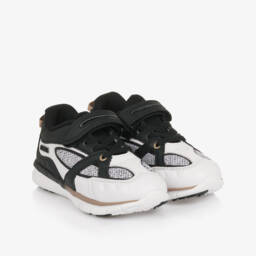 Navy and white logo trainers for boys by BOSS offer a sporty and stylish look with a touch of varsity flair. Crafted from smooth and perforated leather combined with textile panels, these trainers stand out with their multiple logos. The cushioned heel and robust rubber sole ensure comfort and support, perfect for daily adventures. A soft fabric lining and moulded footbed enhance comfort, while classic lace fastenings provide a secure fit. Limited quantities available, so grab them while you can.