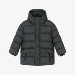 This grey puffer coat for boys by Mayoral combines warmth with a sleek design. The long, padded silhouette ensures comfort and insulation, while the attached hood and elasticated cuffs provide extra protection against the cold. It fastens with a zip and poppers, and has zipped front pockets for added practicality.
