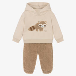 This green tracksuit for little boys by Il Gufo, is both adorable and comfortable. Made in soft fleece, the top has a cosy hood and a charming bear motif on the front. The matching joggers have an elasticated waistband for easy wear.