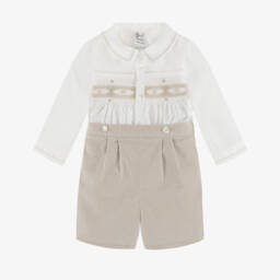 This charming ivory and beige buster suit for little boys by Sarah Louise is exclusive to Childrensalon. Ideal for a special occasion, the long-sleeved shirt is beautifully hand-smocked with delicate embroidery and mother-of-pearl buttons. It is paired with soft velvet shorts, designed to button onto the shirt for a neat, tucked-in look. The elasticated waistband ensures comfort and ease of movement.