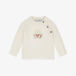 Ivory sweater for older boys by Tartine et Chocolat, made in a beautifully soft and warm wool knit. With a charming Fair Isle-inspired pattern of black snowflakes and red soldiers, this cosy sweater has a ribbed crew neckline and trims for a classic finish.