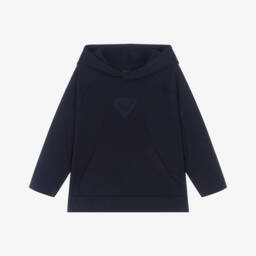 Navy blue hoodie for older boys by Emporio Armani, made in a soft cotton blend with a warm, fleecy inside. This casual top has a split kangaroo pocket and a gently elasticated hem. A tonal blue Eagle logo can be seen on the front for instant brand recognition.