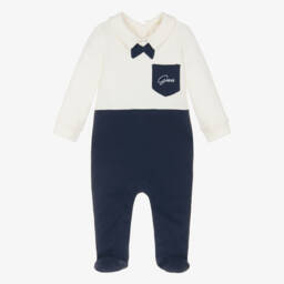 Navy blue babygrow by Guess features a repeated logo pattern. Designed with comfort in mind, this long-sleeved babygrow has an overlapping neckline and popper fastenings for easy dressing. The soft fabric ensures warmth and cosiness, ideal for cooler days.