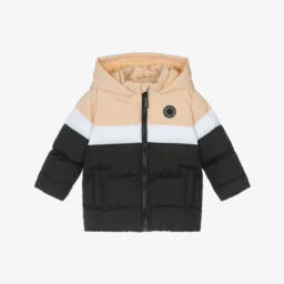 Navy blue puffer coat for boys by Mitch & Son. Made in silky, smooth fabric, it has a fixed hood and is lightly padded for extra warmth. This cosy coat fastens with a zip, which has a useful chin guard and there are zip fastening pockets on the front. For a touch of branding, there is a blue rubberised logo patch on one sleeve.