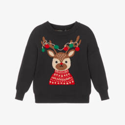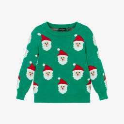 Fun and festive red sweater for boys by Rock Your Baby. Knitted for cosiness and warmth, this vibrant top features a joyful pattern of Christmas motifs including Santa Claus, reindeer, and gingerbread men.