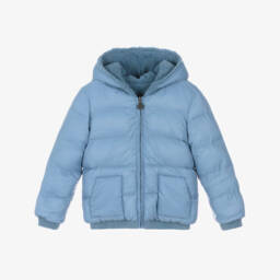 This pale blue hooded jacket for little boys by Tartine et Chocolat, offers two stylish looks. The silky smooth exterior has two front pockets and a logo badge on the chest for instant brand appeal. Fully lined, it is padded for warmth and fastens with a branded zip. For an alternative look, it can be worn with the cosy sherpa fleece on the outside. This versatile piece will keep your little one warm and snug on chilly days.