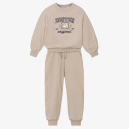 Beige tracksuit for little boys by Mayoral, knitted in a soft viscose blend. This cosy, casual set has a zip-up top with a fixed hood and front pockets. The matching joggers have an elasticated waist with a drawstring for a great fit.