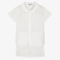 Smart-casual off-white and blue shorts set by Spanish brand Babidu. Understated and traditionally styled, it is made in lightweight cotton with a linen look. The short-sleeved shirt fastens with buttons on the front. Simply pull-up, the waistband of the easy-to-wear shorts is elasticated around the back and they have slanted side pockets.