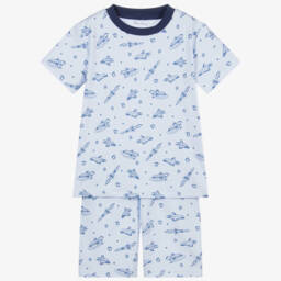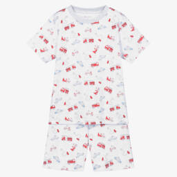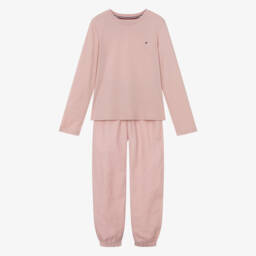 White and navy blue pyjamas for older boys by Tommy Hilfiger, made in soft cotton jersey. The long-sleeved top has a small flag logo on the chest and the coordinating trousers have an all-over flag logo print. They have a comfortable branded elasticated waistband, with useful side seam pockets and ribbed cuffs for a cosy finish.