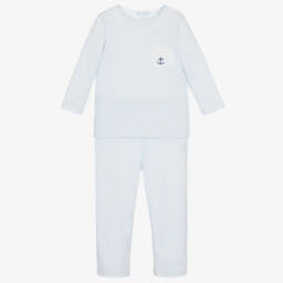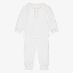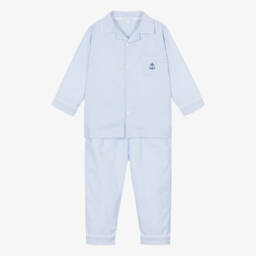 White pyjamas for younger boys by Mini-La-Mode, woven in soft and lightweight Pima cotton. The long-sleeved shirt has a hand-embroidered tractor on the pocket and neat blue piped edges on the collar and cuffs. It fastens with buttons on the front. The matching trousers have an elasticated waist for a comfortable night's sleep.