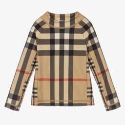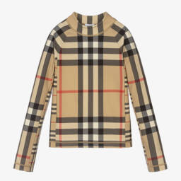 Beige sun protective top for baby boys and girls by British luxury brand Burberry. It has the brand's oversized checks with Vintage check panelling for an unmistakably Burberry iconic look. Stylish and comfortable for the pool and beyond, it is super smooth and stretchy with popper fastening on the back to make changing easier. The main material of this product is made with at least 70% recycled content.