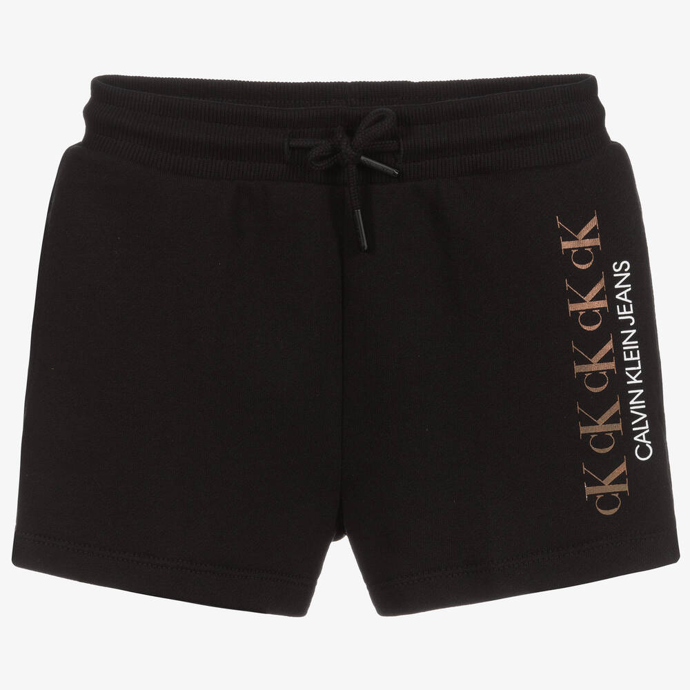 Girls black shorts by Calvin Klein Jeans, made in mid-weight organic cotton jersey. They have a white and gold repeat logo print on the side. There are pockets on the hips, and the elasticated waistband has a drawstring tie.