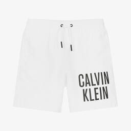 Boys white swim shorts by Calvin Klein. Made in recycled polyester, they have an adjustable drawstring at the front, side pockets and one on the back with velcro closure. A white logo print is on one leg and they have a mesh lining for comfort and support.