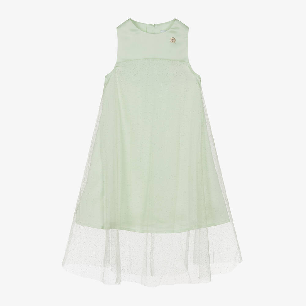 Girls mint green satin tulle dress by Calvin Klein is a beautiful choice for special occasions. Made from silky satin with a sparkly tulle overlay, it features a smooth A-line shape and a sleeveless design. The concealed zip fastening at the back ensures a seamless finish. Perfect for parties, this elegant dress is available in limited quantities, so act fast.