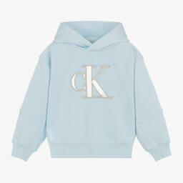 Girls white cotton monogram hoodie by Calvin Klein, featuring a striking metallic silver logo appliqué on the front. Crafted from comfortable sweatshirt jersey, it boasts relaxed, drop-shouldered long sleeves with side panels and deep vents for easy movement. The hood is lined with soft, lightweight jersey, complemented by ribbed trims on the cuffs and hem. Limited quantities available, so act quickly to secure this stylish piece.