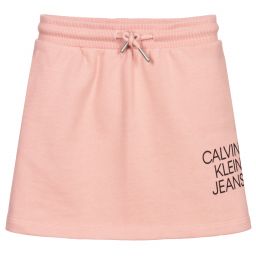 Girls pale pink skirt by Calvin Klein Jeans, made in organic cotton jersey. It has a silver and black logo print, and an elasticated drawstring waistband. There are useful pockets on the hips.