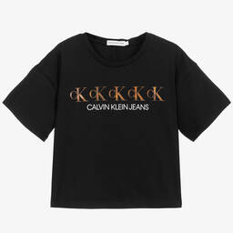 Teen girls pink jersey T-shirt by Calvin Klein Jeans, in a boxy shape and shorter length. Soft and stretchy, this organic cotton top has the Calvin Klein metallic logo print in black and gold.