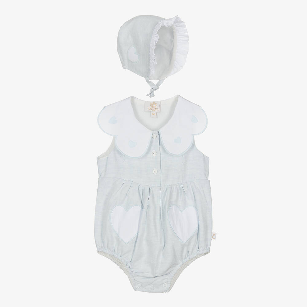 In pale blue and white, a charming shortie and bonnet set for baby girls by British brand Caramelo Kids. Both pieces are woven in a soft linen and cotton blend, with a lightweight lining for extra comfort. The shortie has a lovely scalloped collar and sweet heart detailing. It fastens with buttons at the top and with poppers between the legs. The coordinating bonnet has a pretty ruffle trim and secures with ties under the chin.
