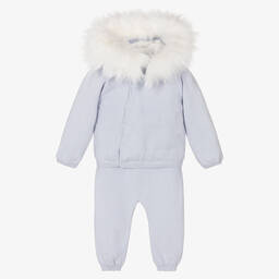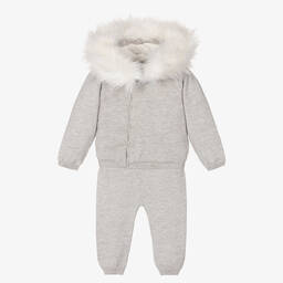 Charming beige trousers set for little boys and girls by Caramelo Kids, knitted in soft and lightweight cotton blend. Lovely for styling on casual days, the top has a removable faux fur trim that buttons onto the hood. It has a tonal logo embroidery and poppers fastening on the front, pairing easily with matching trousers.